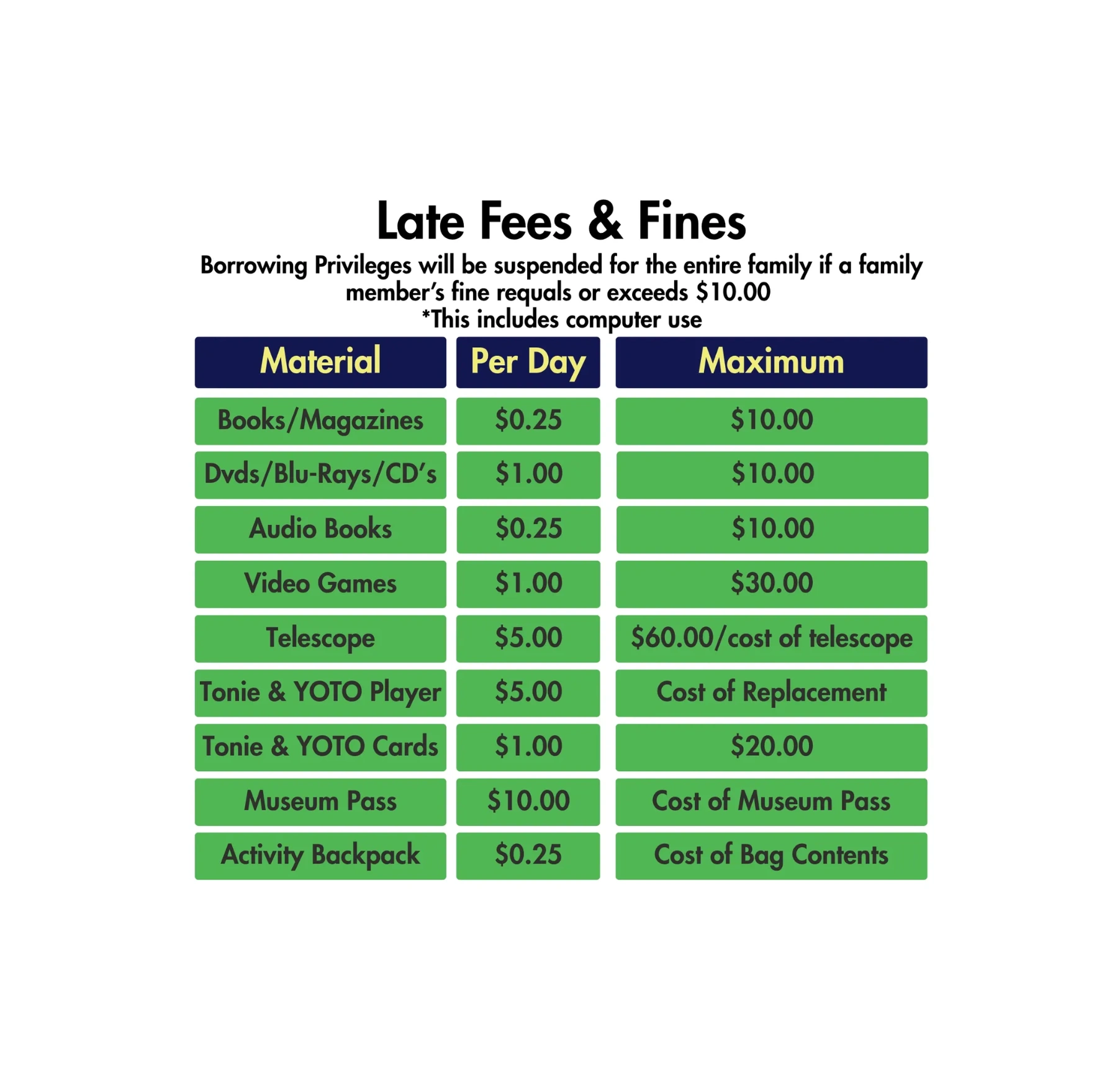 Fines do not accumulate when the library is closed for an entire day (Sundays, holidays, etc.).